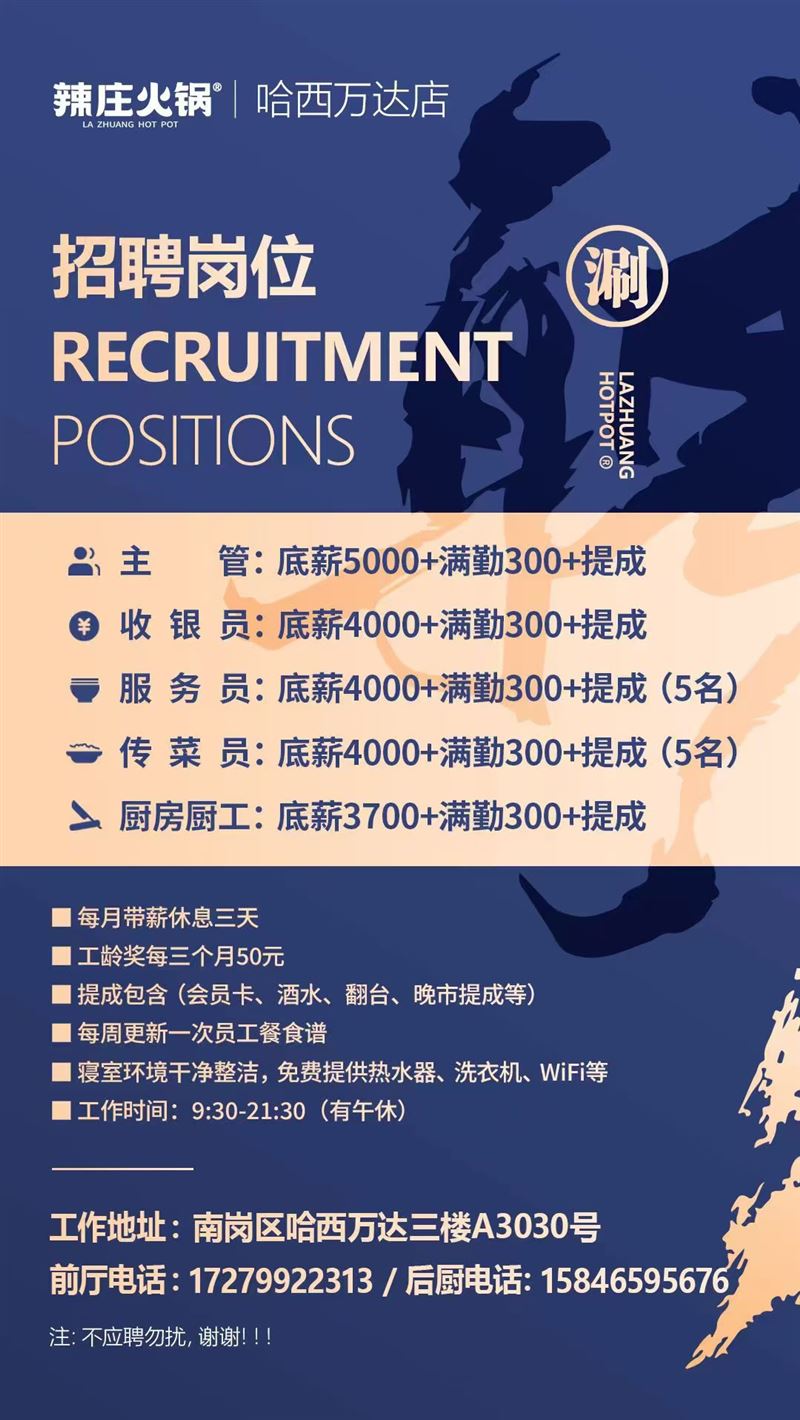 服務(wù)員底薪4000加滿勤300加提成(5名)傳菜員底薪4000加滿勤300加提成(5名)