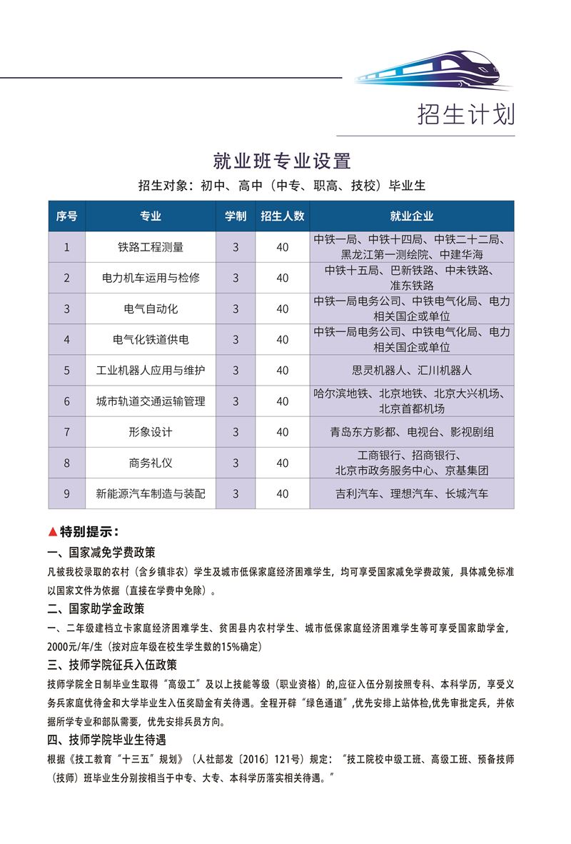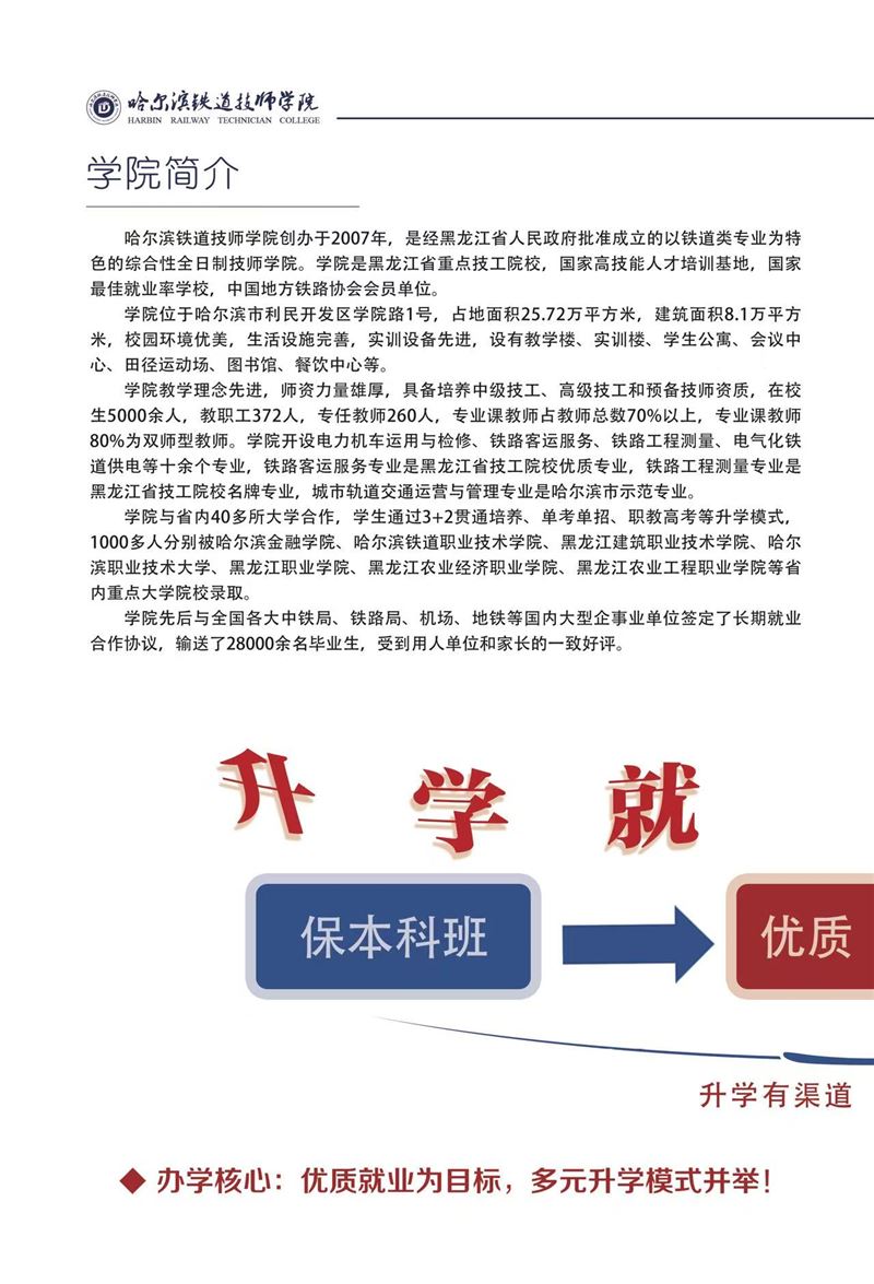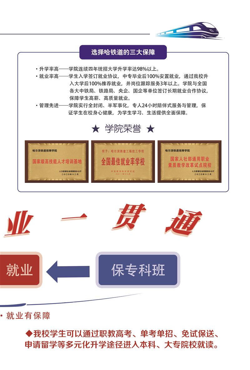 哈鐵道面向全市初中同學招生,高考成績不理想,考不上重點高中的。學習成績不好,想找份兒工作。中專,大專,本科都可以來我學校。入學即簽訂就業(yè)協(xié)議。中國50多家鐵路央企國企部門學費低。